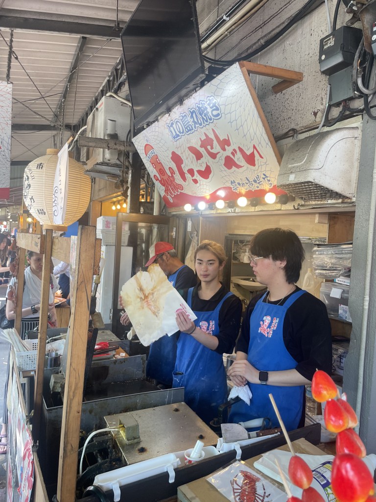 While walking around Tokyo with no general direction may be the best way to truly experience the city, there are a few places like the Tsukiji Fish Market that every tourist has to visit. We heard about this place while talking to some other Americans at dinner one night and decided to take the train over the next morning. Like everything else in Tokyo, there’s alot going on at one time. Think of your standard farmer’s market with stalls of food but then smush them all together into small side streets and add in thousands of people.