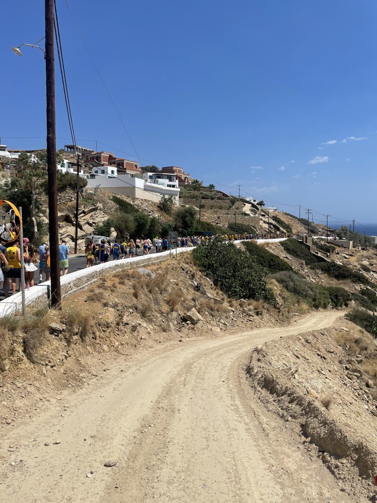 On this day, the bars in Ios open around 9am and everybody begins celebrating early in the morning. Patrons come decked out in blue and yellow clothing in order to represent Sweden. Many people who were there weren’t Swedish but still dressed for the occasion. Later in the afternoon, many people will all walk 1.5 miles down to the beach where the celebration is held.